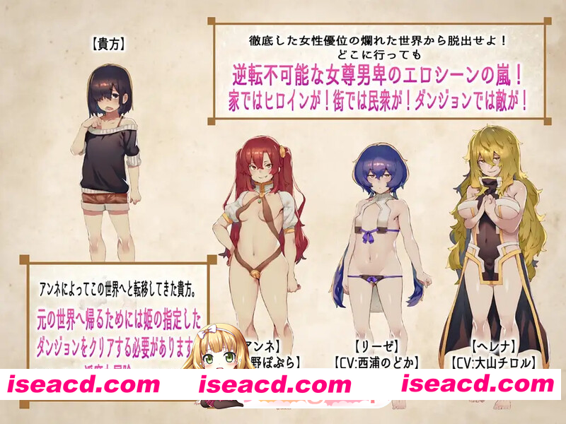 游戏概述: 一款拥有200个以上エロ事件,30多个女角全CV配音的神奇爆款大作! 以做ASMR游戏出名的B社出品的异世界超强逆推MAX炸金RPG~ 这是[B-bishop]发布的一款超强无敌多エロ的逆推类RPG大作。 游戏DL上已卖出27000+销量,属于超级大爆款,非常受欢迎。 讲述一个正太掉进了全是银乱大姐姐的小姐姐的异世界里的社保故事。 B社一如既往的雌小鬼画风,非常实用,而且因为是做ASMR游戏出身, 所以为所有女角都搭配全CV语音,一边逆推一边嘲讽的CV特有感觉! 每个女角都有5到16种事件,奇妙事件超过200种以上!社保值MAX! 游戏内容: 转生到异世界的男主,来到一个女性压倒性强势的世界。 这里从国王,到居民,到战士,到怪物全部都是女性… 男主无论走到哪里遇到任何女NPC都会被逆推侵饭! 他能在被无限炸金的异世界存活,安全回到原来的世界吗? 超华丽的角色阵容: 登场女角色=エロ场景角色超过30个! 每个女角都有5种至15种左右的社保炸金CG事件。 启用的CV声优共15名声优!37个角色全语音。 奇妙场景近200个,总CG数超过1000张,8500句配音! エロ场景的丰富程度非常离谱: 除了女主三人外,和街道很多NPC也有大量H,每个角色至少有5个H场景。 战斗方面也有非常多的敌人女性,包括女BOSS在内每个敌人女性都有特殊的H攻击场景(带语音)。 而且败北还有不同的H场景,每个敌人女性最少有3个H场景。 还有本作特有的[败北后的监狱惩罚和[没钱住院的捐精事件玩法。