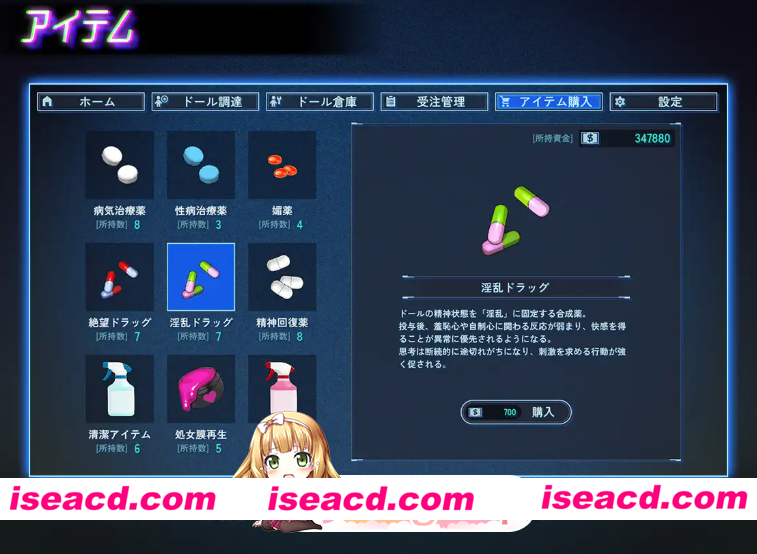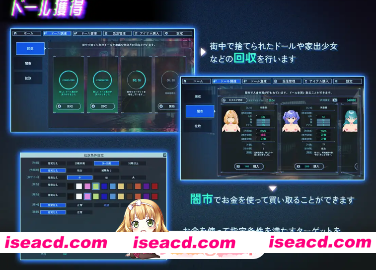 [PC/日式RPG/新作] 地下城人偶商店 アンダーシティドールショップ 官中版 [710M] 游戏简介: 这是一款什么样的游戏? 你扮演一位在“地下城”一隅经营着一家“人偶商店”的店主。 然而,这里所经营的“人偶”并非由塑料或布料制成。 在街上捡到的少女、拐来的离家出走的孩子—— 你将她们强行清洗干净,刻上条形码,经过“加工”后作为“商品”出货。 这是一款描绘如此黑暗且背德世界观的经营模拟游戏。 游戏特色 每次都有不同的少女登场:通过随机生成系统,每次游玩都能迎来新的邂逅。 经营与情色元素的融合:在扩大人偶商店规模的同时,还能享受各种“加工”的乐趣。