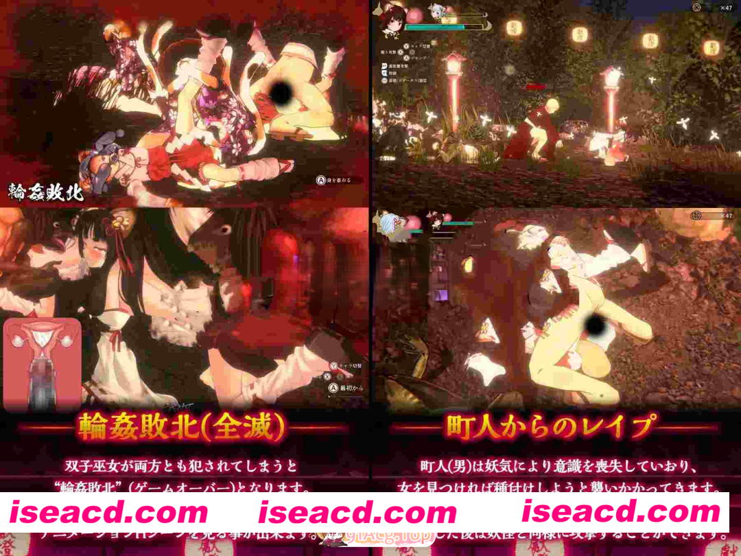 作品内容 双子协作战斗的新体验3D横版滚轴动作游戏! 魑魅魍魉潜入夏季庙会!操作神使双子巫女,协作打败妖怪的新体验动作游戏! 通过在没有场景切换的开放式地图上的实时战斗色情,打破看色色场景=游戏失败的刻板概念! 被侵犯时游戏进度会暂停,可以360度仔细欣赏!只要切换操作角色后,救出另一方即可继续游戏! 如果全灭就会游戏失败,进入用流畅的Live2D动画描绘的被妖怪带回巢穴强○的场景! 不仅有侵犯和怀孕(异种奸、受精、妊娠),还可以被蛞蝓妖怪变成扶她,去侵犯惊慌逃跑的NPC,甚至侵犯自己的姐姐/妹妹强○播种! 支持震动手柄!在战斗部分和色色部分都能体验身临其境之感! 登场角色介绍 ■伊奈・璃奈(CV:琴音有波 / 来夢ふらん) 某个村庄供奉的稻荷神社的神使(眷属)双子 因为在期待的夏季庙会上,妖怪袭击了村庄,所以奉神明之命降临现世 ■妖怪们 袭击村庄的魑魅魍魉。平时并没有什么攻击性的妖怪也前来袭击,一定是受到了什么东西的影响。 其中存在拥有强大攻击力的Boss妖怪。 倒地时被袭击就会当场开始战斗色情! ■战斗部分 这是通关型的3D横版滚轴动作游戏。 运用连击和特殊技能歼灭敌人,用获得的报酬强化装备推进游戏。 关键在于根据敌人种类区分使用物理攻击和远程攻击,通过切换操作角色灵活应战! ■战斗色情 如果受到攻击倒地的时候被袭击,妖怪们就会毫不留情地侵犯,进入战斗色情! 这不需要切换到其他场景,而是当场切换镜头视角,开始实时3D强○! 强○开始后,游戏进度会暂停,可以360度旋转镜头仔细欣赏。 只要切换角色攻击怪物即可救出同伴,不经历游戏失败也能享受强○场景! ■败北轮○(全灭) 巫女双子同时被侵犯时就会进入“败北轮○”(游戏失败)。 所以如果有一方被侵犯的时候,推荐尽快切换到另一名角色救援。 全灭后,如果选择“放弃抵抗”就会被妖怪带回巢穴, 可以看到以Live2D动画描绘的H场景。 看过一次的H场景可以通过在隐世温泉睡觉再次观看。 ■村民强○ 男村民在妖气作用下会丧失自我,如果他们发现体力虚弱的巫女们,就会袭击她们尝试播种射精。 因为村民是需要保护的对象,所以不能攻击无辜的村民,但可以攻击犯下罪行的村民,和攻击妖怪时一样。 所以就算附近没有妖怪也请不要掉以轻心。 袭击和平村庄的百鬼夜行和在隐世温泉的升级 ■多种多样的魑魅魍魉 不同强度、不同颜色的妖怪一共有28种(16个种族)登场。 有的妖怪物理防御很高,但对远距离攻击很弱,有的妖怪攻击力很强但攻击速度很慢,个性多种多样。当然强○的个性也多种多样。 ■丰富多彩的关卡构成 从有神社的深山到繁华的城市,内容丰富的20个关卡。 如果感觉Boss太强打不过,就去等级低一些的关卡收集报酬强化装备吧。 ■隐世温泉 行商狸猫在现世和浮世之间穿梭,经手稀有商品。 他精力旺盛,所以讨价还价时也许可以用身体代替金钱交易…? ■休息的床铺 在床铺休息的时候可以在梦中观看至今为止经历过的败北轮○Live2D动画,内容可以自由组合。 扶她化和怀孕、分娩模拟 ■蛞蝓妖怪的扶她化 倒地时被蛞蝓妖怪袭击后会被寄生,变成类似男性器的形状,「扶她」化! 只要碰到任意“女孩子”,不论善恶都会袭击上去! 虽然可以通过攻击让两者分离,从而取消强○,但必须在女性体内射精一次之后才能解除扶她化。 (※扶她化设定可以关闭) ■扶她化时要小心百合强○ 扶她化时不仅会袭击村民少女,就算双胞胎姐妹彼此接触也会二话不说开始侵犯! 因为这种情况没有人能救援,会导致全灭,所以扶她化后尽快找村民少女解决吧。 ■妊娠模拟 巫女双子拥有高速的生理周期,每个周期相当于现实时间5分钟。 因为是神使所以任何种族的精液都能使其怀孕,在排卵期被内射精液就会受精。 (※妊娠、分娩设定可以关闭。但依然会有排卵、受精) ■小心战斗时分娩 分娩时会强○HP清空倒地,所以即将分娩的状态下请格外小心。 妊娠状态只有在现世会推进,所以在浮世的隐世温泉不会发生怀孕或分娩,这一点也需要注意。