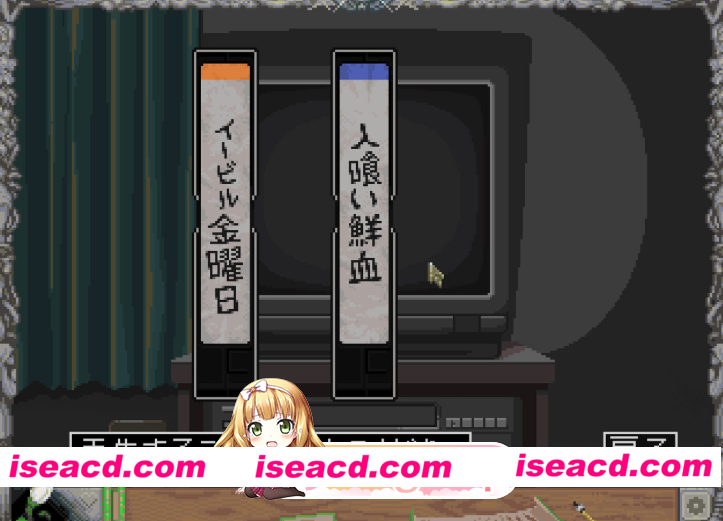 常去的录像带租赁店里的特价推车。 那里扔着一盘在录像带泡沫经济时期的混乱中发行的、闻所未闻的恐怖片。 明明是特价处理品,宣传语却很是花哨,价格也是1000日元这种莫名强硬的设定。 即便如此,你还是买下了它。 买完之后是后悔……自嘲……随后是一股扭曲的喜悦。(虽然电影内容本身很无聊)