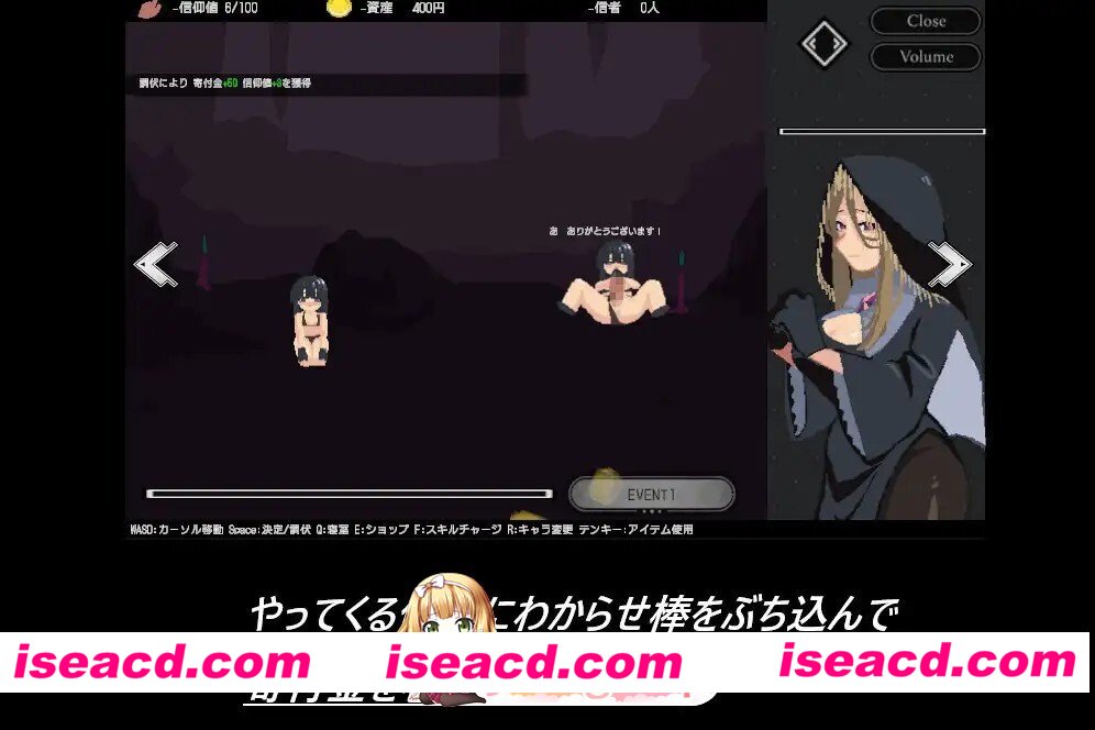 游戏简介 成为邪教教主,大肆赚钱吧 普通信徒酱来了。 用教主的“教训棒”来调伏她们吧。 哦?要给我钱吗? 太好啦! 利用4位干部的技能(贤者时间),高效地发展教团吧。 ※ 故事较短,约40分钟~1小时即可...