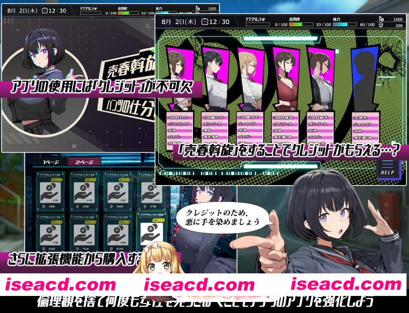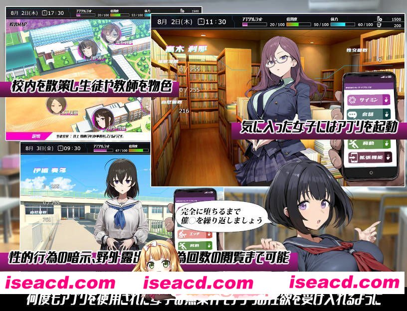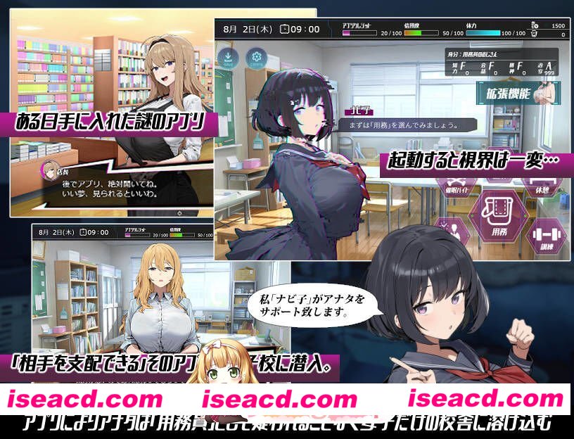 <剧情概要> ・主角常年身无分文,没有固定职业,每天晚上泡在成人用品店里就是他的生存意义。某天,店长向他推荐了一款神秘手机应用,他虽感可疑,还是回家安装了。 就在安装完成的瞬间,一个似曾相识的美少女出现在他眼前……然而,与他所认识的她不同,这位少女缺乏情感表现,自称“导航员”。 接着,她声称主角安装的应用是一款可以随心所欲操纵自己喜欢对象的应用。主角半信半疑,正心不在焉地听她说明时,意识突然变得模糊。等他醒来时,自己已经成了“女子学校的勤务工”,而且谁都没有对他产生怀疑,他可以自由行动…… 相信了应用力量的主角,面对无数来来往往的女学生,难掩兴奋。 但导航员告诉他,无法一瞬间就让对方发生性行为,使用应用并深入对方深层心理才是关键。 主角按照既定步骤接触学生们内心的黑暗,最终如愿以偿地随意支配她们的身体。 与此同时,他被迫履行勤务工的职责,并且为了获取使用应用所需的点数,一再染指非人道的兼职工作。 这款应用的真相是什么?导航员的目的又是什么? <游戏系统> ・遵循导航员“娜比子”的指示,完成“勤务工”的职责,同时为了补充使用应用所需的点数,完成“催○兼职”,从而可以对校舍中的女主角们使用应用。 单次使用效果较弱,需要通过多次消耗点数,增强支配效果,才能让她们最终交出身体。 交换了联系方式的对象,即使在夜间也可以叫到学校来,可以高效地推进支配过程。 每位女主角的行动模式不同,因此需要多次在校舍中漫步,一边补充点数,一边交替推进攻略。 ・夜晚的街道上,还可以用钱进行特殊行动。 甚至能与连月经都还没来的孩子们进行后宫玩法…… <H场景与女主角介绍> 学生共10人+1人。 每位主要角色收录5个场景。
